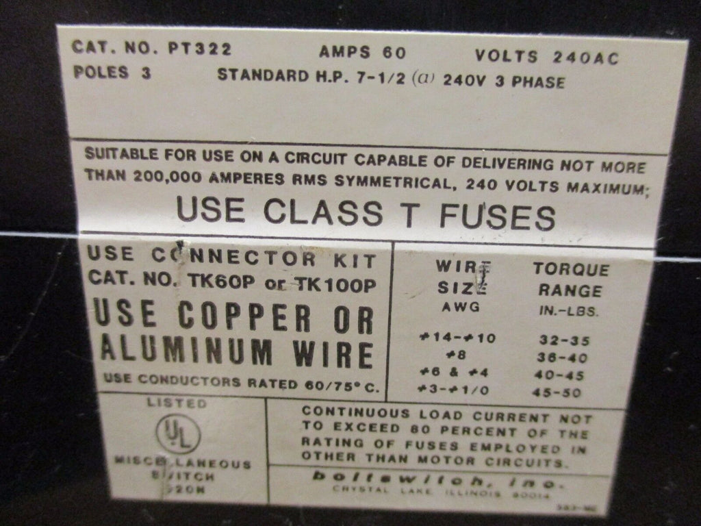 Boltswitch Fuse Pullout Switch PT322 60A 240V 3P Used