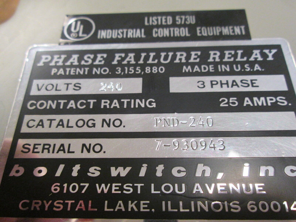 Boltswitch Phase Failure Relay PND-240 25A 240V 3Ph New Surplus