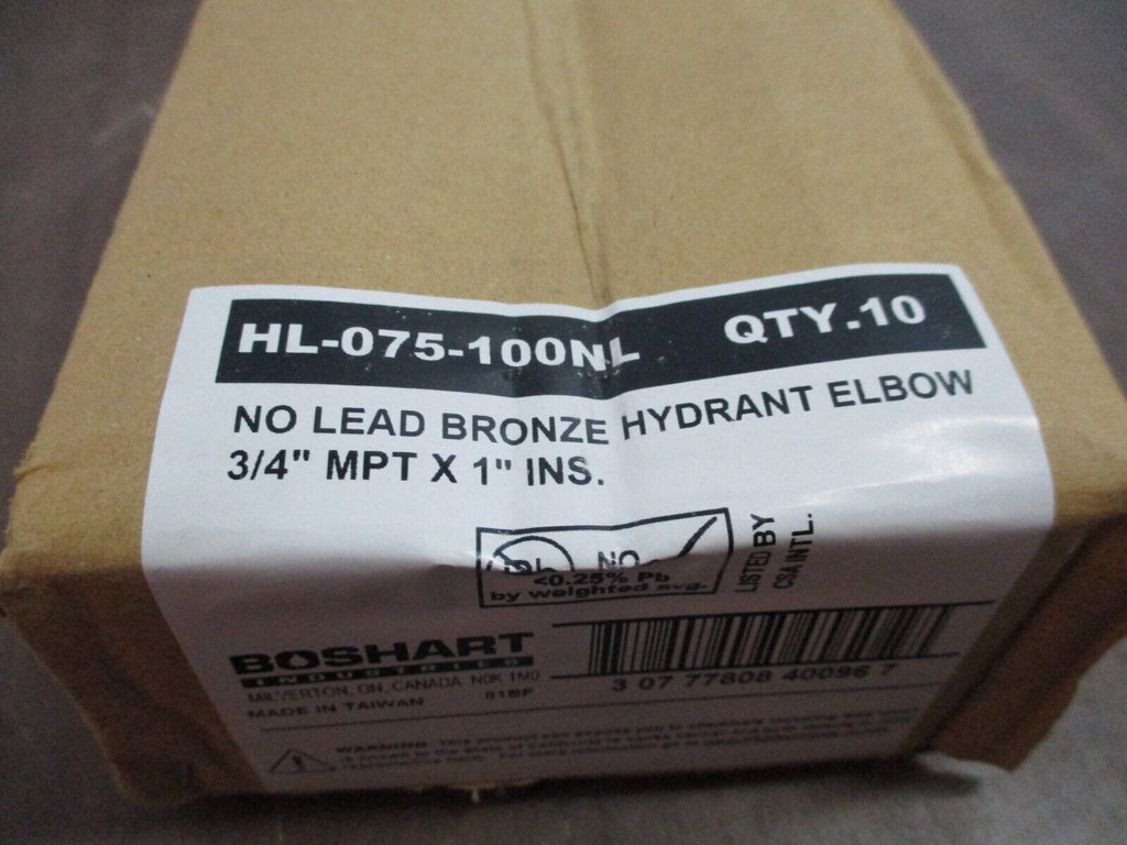 Boshart Bronze Hydrant Elbow HL-075-100NL 3/4" MPT x 1" Ins. No Lead *Box of 10*_x000D_ Condition: New – Open boxBrand: BoshartMPN: HL-075-100NL Boshart Bronze Hydrant Elbow HL-075-100NL 3/4" MPT x 1" Ins. No Lead *Box of 10* Boshart Bronze Hydrant Elbow Part #: HL-075-100NL 3/4" MPT x 1" Ins. No Lead *Box of 10* New SurplusLoc: 22D5-20 Boshart Bronze Hydrant Elbow Part #: HL-075-100NL 3/4" MPT x 1" Ins. No Lead *Box of 10* New Surplus Loc: 22D5-20