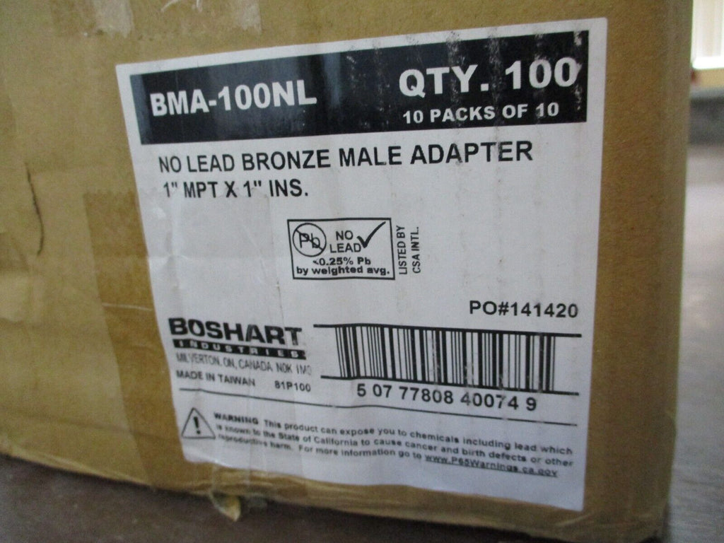 Boshart Bronze Male Adapter BMA-100NL 1" MPT x 1" Ins. No Lead *Box of 100* Condition: New – Open boxBrand: BoshartMPN: BMA-100NL Boshart Bronze Male Adapter BMA-100NL 1" MPT x 1" Ins. No Lead *Box of 100* Boshart Bronze Male Adapter Part #: BMA-100NL 1" MPT x 1" Ins. No Lead *Box of 100* New Surplus Loc: AB11-5161 / AB4F2 Boshart Bronze Male Adapter Part #: BMA-100NL 1" MPT x 1" Ins. No Lead *Box of 100* New Surplus Loc: AB11-5161 / AB4F2