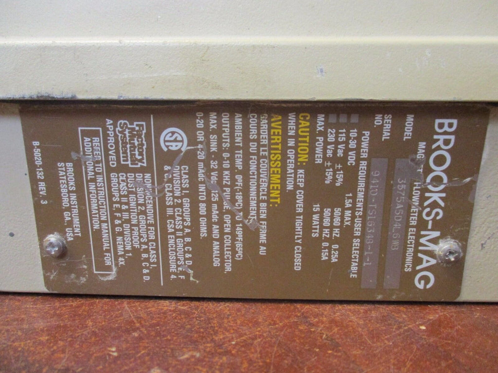 Brooks-Mag Magnetic Flowmeter 3575A5D4L6WB Used_x000D_ Condition: UsedMPN: 3575A5D4L6WBBrand: Brooks-Mag Brooks-Mag Magnetic Flowmeter 3575A5D4L6WB Used Brooks-MagMagnetic FlowmeterPart # 3575A5D4L6WB10-30 VDC 1.5A115 VAC 0.25A230 VAC 0.15UsedLOC 19I5-6 Brooks-Mag Magnetic Flowmeter Part # 3575A5D4L6WB 10-30 VDC 1.5A 115 VAC 0.25A 230 VAC 0.15 Uséd LOC 19I5-6