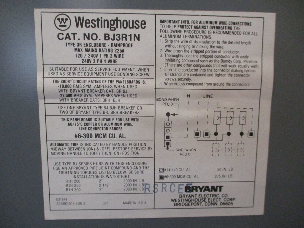 Bryant 3R Main Lug Load Center BJ3R1N 225A 120/208/240VAC 3Ph 4W New Surplus_x000D_ Bryant 3R Main Lug Load Center Part #: BJ3R1N 225 A 120/208/240 VAC 3Ph 4W New Surplus Loc: AB11-7344 / AB7B3