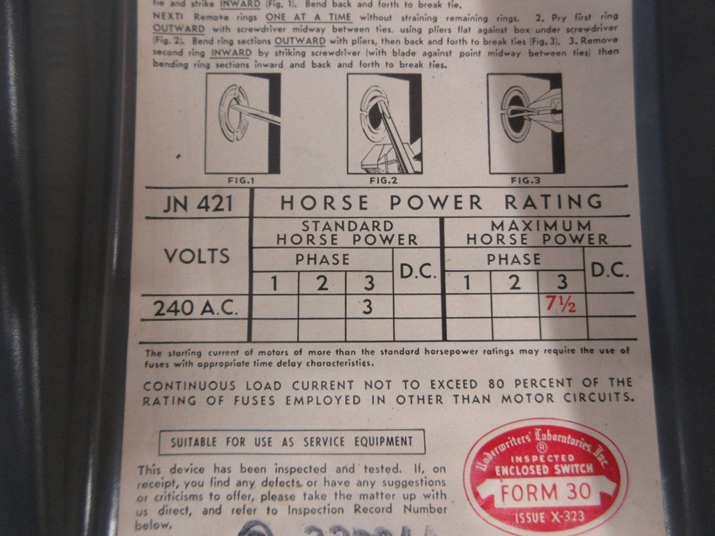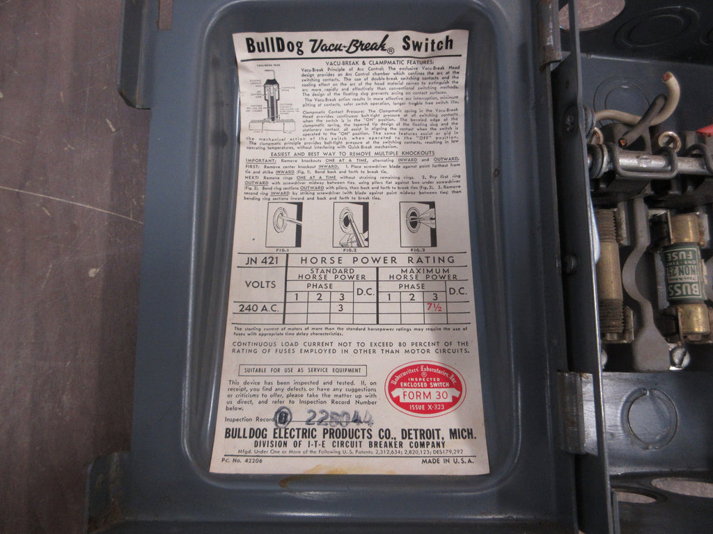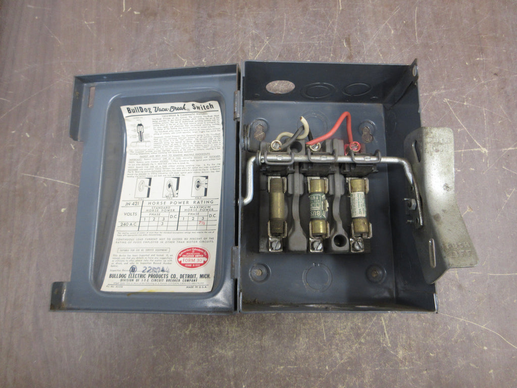 Bulldog Fusible Safety Switch / Disconnect JN-421 30A 240V 3Ph Used