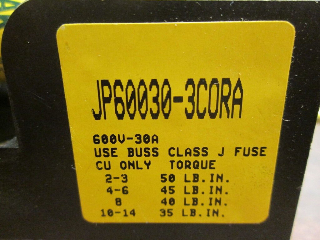 Buss Fuseblock JP60030-3CORA 30A 600V 3P w/ 25A Fuses Used Condition: UsedBrand: BussmanMPN: JP60030-3CORAType: Fuse Block Buss Fuseblock JP60030-3CORA 30A 600V 3P w/ 25A Fuses Used Buss FuseblockPart # JP60030-3CORA 30A 600V 3P w/ 25A Fuses UsedLOC 21C4-38 Buss Fuseblock Part # JP60030-3CORA 30A 600V 3P w/ 25A Fuses Uséd LOC 21C4-38