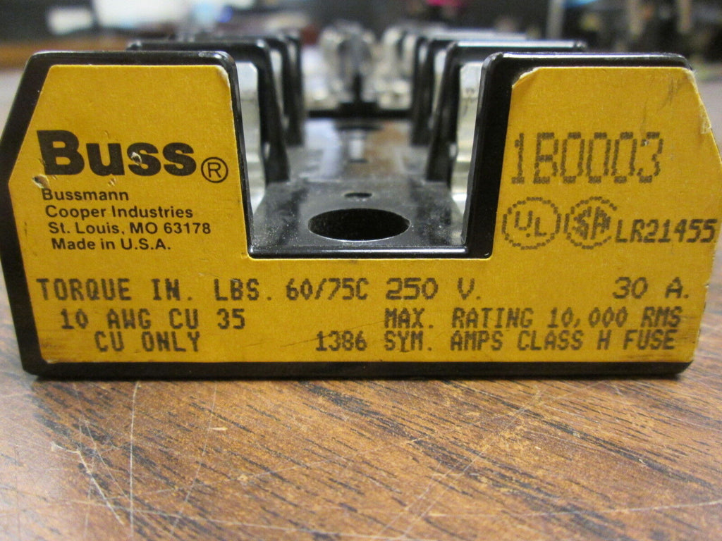Buss Fuseholder 1B0003 30A 250V 3P *Lot of 2* Used Condition: UsedBrand: BussMPN: 1B0003 Buss Fuseholder 1B0003 30A 250V 3P *Lot of 2* Used Buss Fuseholder Part #: 1B0003 30A 250V 3P *Lot of 2* UsedLOC 19A5-30 Buss Fuseholder Part #: 1B0003 30A 250V 3P *Lot of 2* Uséd LOC 19A5-30