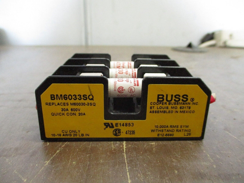 Buss Fuseholder BM6033SQ 30A 600V 3P w/ (3) 30A Fuses Used_x000D_ Condition: UsedBrand: BussColor: BlackCurrent Rating: 16-30 AMPN: BM6033SQMaximum Amperage: 30 ANumber of Poles: 3Type: Fuse HolderVoltage: 551-600 V Buss Fuseholder BM6033SQ 30A 600V 3P w/ (3) 30A Fuses Used Buss Fuseholder Part #: BM6033SQ 30 A 600 V 3P w/ (3) 30A Fuses Used Loc: 10C4-73 Buss Fuseholder Part #: BM6033SQ 30 A 600 V 3P w/ (3) 30A Fuses Uséd Loc: 10C4-73