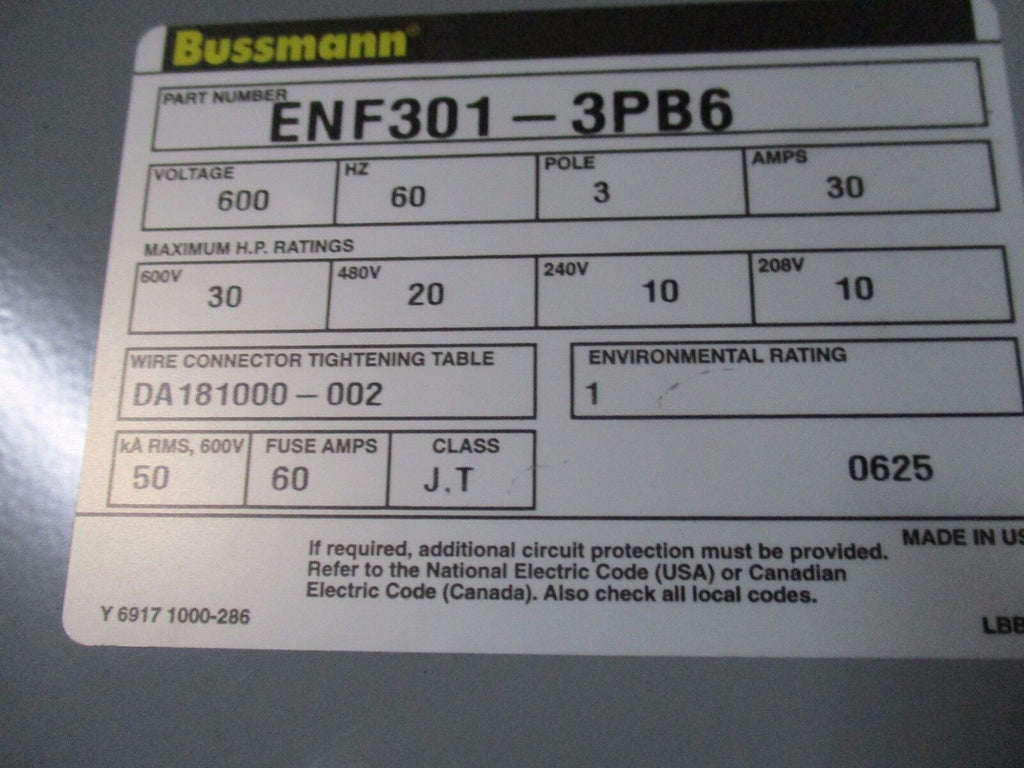 Bussmann Enclosed Disconnect Switch ENF301-3PB6 30A 600V 3P 60Hz Used