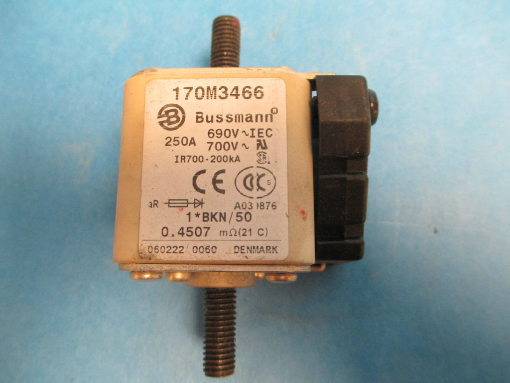 Bussmann Fuse 170M3466 250A 700V Condition: UsedBrand: BussmannMPN: 170M3466Country of Manufacture: Denmark Bussmann Fuse 170M3466 250A 700V Bussmann Fuse 170M3466 250A 700VLoc. 4L3-9 Bussmann Fuse 170M3466 250A 700V Loc. 4L3-9