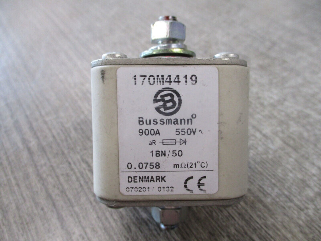 Bussmann Fuse 170M4419 900A 550V Used Condition: UsedBrand: BussmannMaximum Amperage: 900 AVoltage: 550 VColor: BeigeCurrent Rating: 900 AMPN: 170M4419 Bussmann Fuse 170M4419 900A 550V Used Bussmann Fuse Part #: 170M4419 900A 550V UsedLOC: 27I3-23 Bussmann Fuse Part #: 170M4419 900A 550V Uséd LOC: 27I3-23