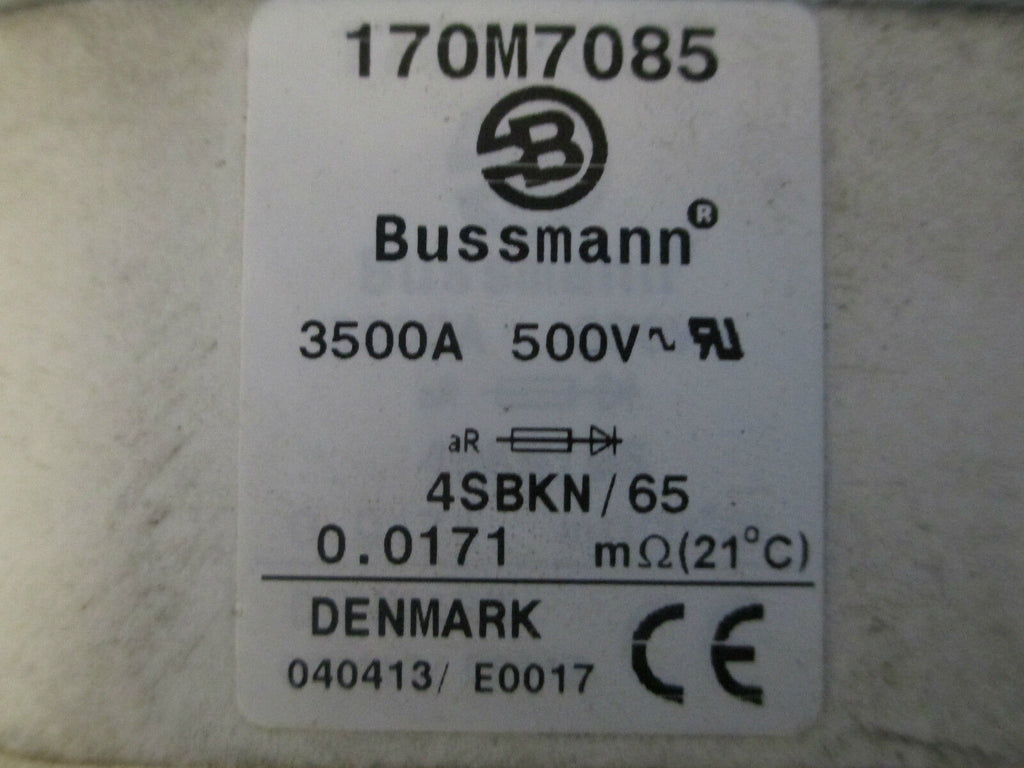 Bussmann Fuse 170M7085, 3500A 500V Condition: UsedBrand: BussmannMPN: 170M7085Country of Manufacture: Denmark Bussmann Fuse 170M7085, 3500A 500V Bussmann Fuse Part # 170M6665 3500A 500V Used Loc 4J3 Bussmann Fuse Part # 170M6665 3500A 500V Uséd Loc 4J3