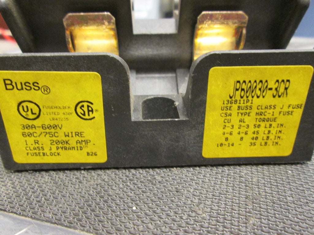 Bussmann Fuse Block JP60030-3CR 30A 600V Class J Fuse Used