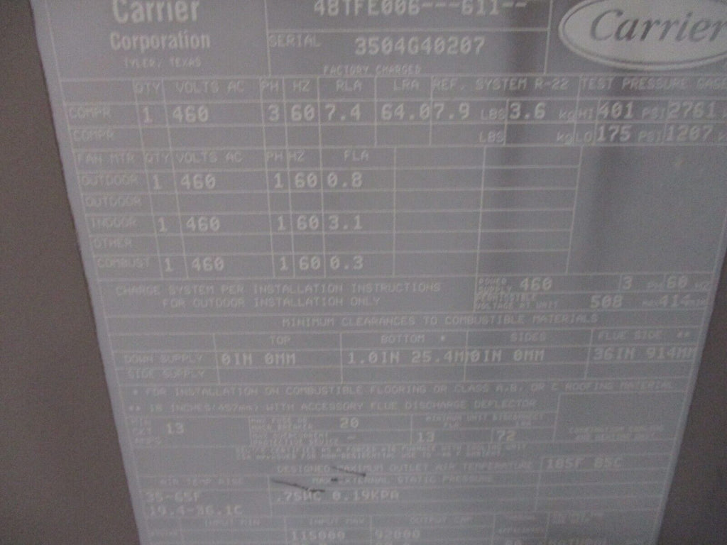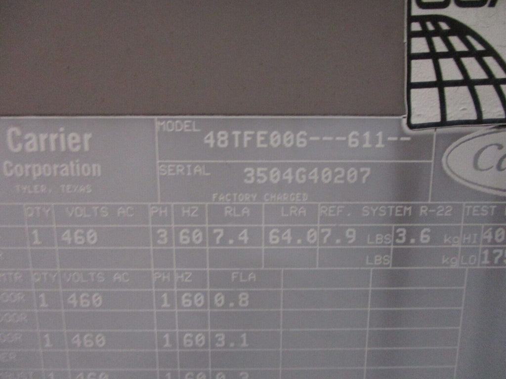 Carrier 48TFRooftop Unit 48TFE006---611-- 5 Ton 460V 3Ph Medium Heat Option Used Condition: UsedRefrigerant: R-22Year Manufactured: 2004MPN: 48TFE006---611--Brand: CarrierCarrier 48TFRooftop Unit Part #: 48TFE006---611-- 5 Ton 460 V 3Ph Medium Heat Option Charged With R-22 MFD: 2004 Used Loc: AB11-4549 / AB36D4
