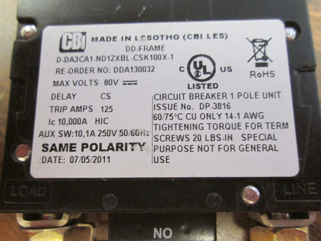 CBi DC Circuit Breaker D-DA3CA1-ND1ZXBL-CSK100X-1 100A 80VDC 1P Used