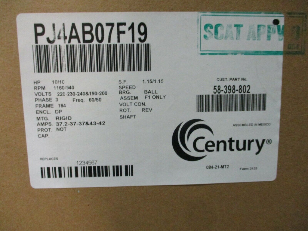 Century AC Motor PJ4AB07F19 10HP 1200RPM 184 Frame DP Enclosure New Surplus Century AC Motor Part #: PJ4AB07F19 10HP 1160RPM 184 Frame DP Enclosure 220-230-240V 3Ph New Surplus Weight: 160 lbs. LOC AB11-3233 / (AB41E1) Century AC Motor Part #: PJ4AB07F19 10HP 1160RPM 184 Frame DP Enclosure 220-230-240V 3Ph New Surplus Weight: 160 lbs. LOC AB11-3233 / (AB41E1)