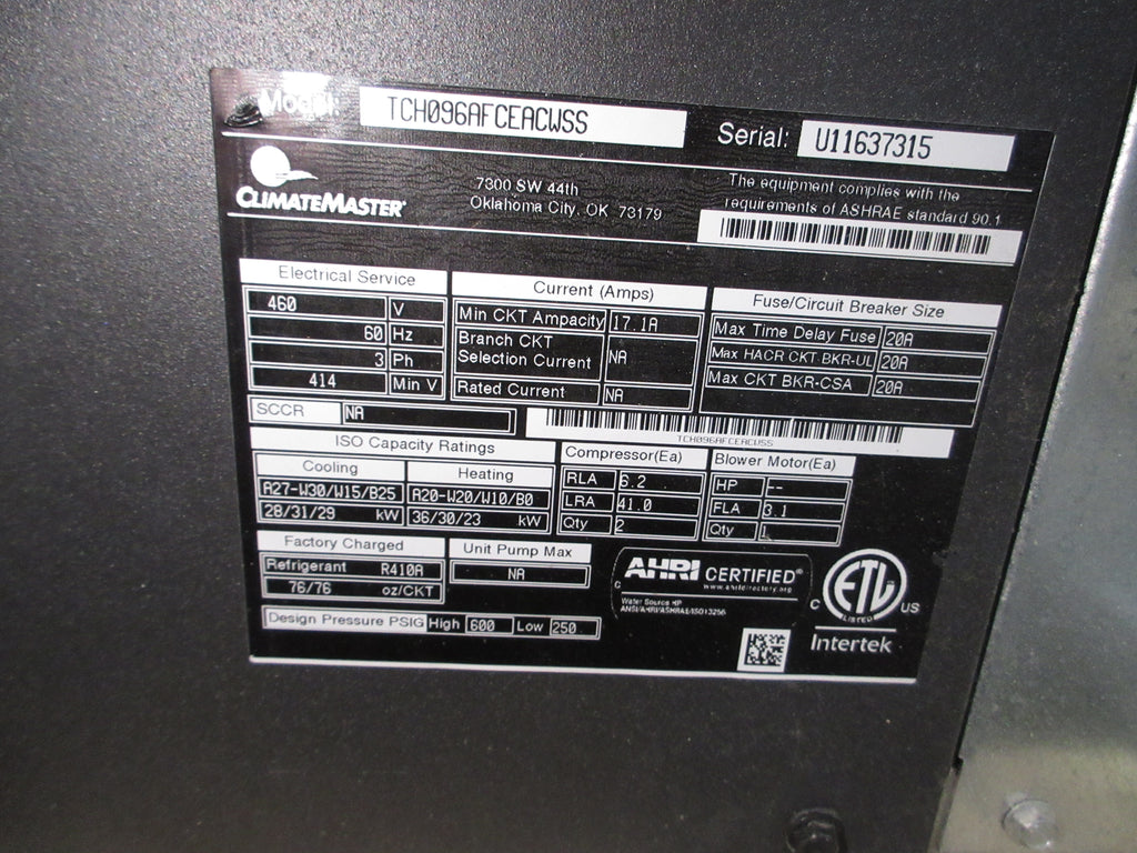 ClimateMaster Tranquility Water-Source Heat Pump TCH096AFCEACWSS 460V 60Hz 3Ph Used