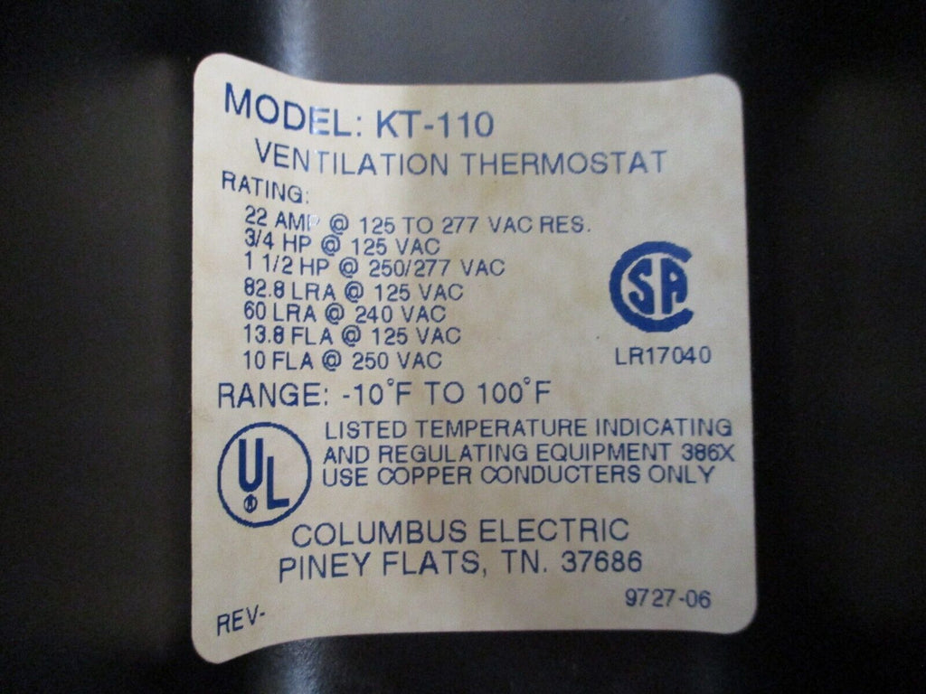 Columbus Electric Ventilation Thermostat KT-110 Range: -10°F - 100°F Used Condition: UsedBrand: Columbus ElectricMPN: KT-110 Columbus Electric Ventilation Thermostat KT-110 Range: -10°F - 100°F Used Columbus Electric Ventilation Thermostat Part #: KT-110 Range: -10°F - 100°F *No Cover Screw* Used Loc: 28J5-21 Columbus Electric Ventilation Thermostat Part #: KT-110 Range: -10°F - 100°F *No Cover Screw* Uséd Loc: 28J5-21