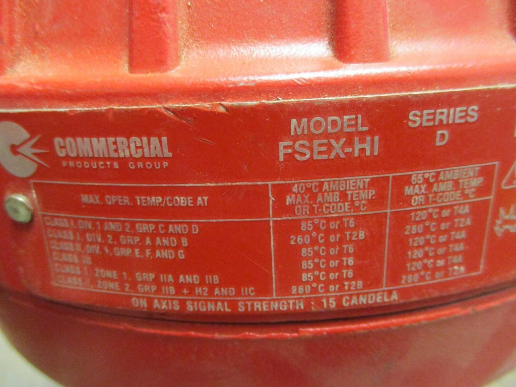 Commercial Products Group Explosion Proof Strobe Light FSEX-HI Ser. D 15 Candela Condition: UsedBrand: Commercial Products GroupMPN: FSEX-HI Commercial Products Group Explosion Proof Strobe Light FSEX-HI Ser. D 15 Candela Commercial Products Group Explosion Proof Strobe Light Part #: FSEX-HI Ser. D 15 Candela 24VDC 1.9A 4X Enclosure UsedLOC AB4C2-13 Commercial Products Group Explosion Proof Strobe Light Part #: FSEX-HI Ser. D 15 Candela 24VDC 1.9A 4X Enclosure Uséd LOC AB4C2-13