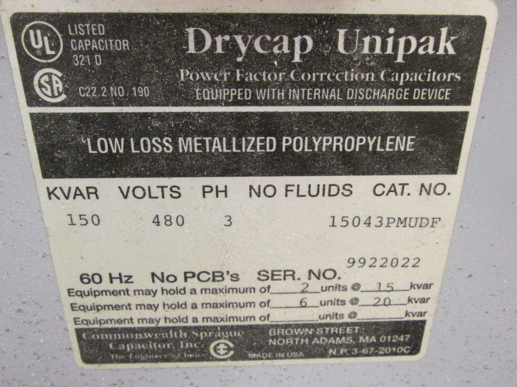 Commonwealth Sprague Drycap Unipak Capacitor 15043PMUDF 150KVAR 480V 3Ph 60Hz