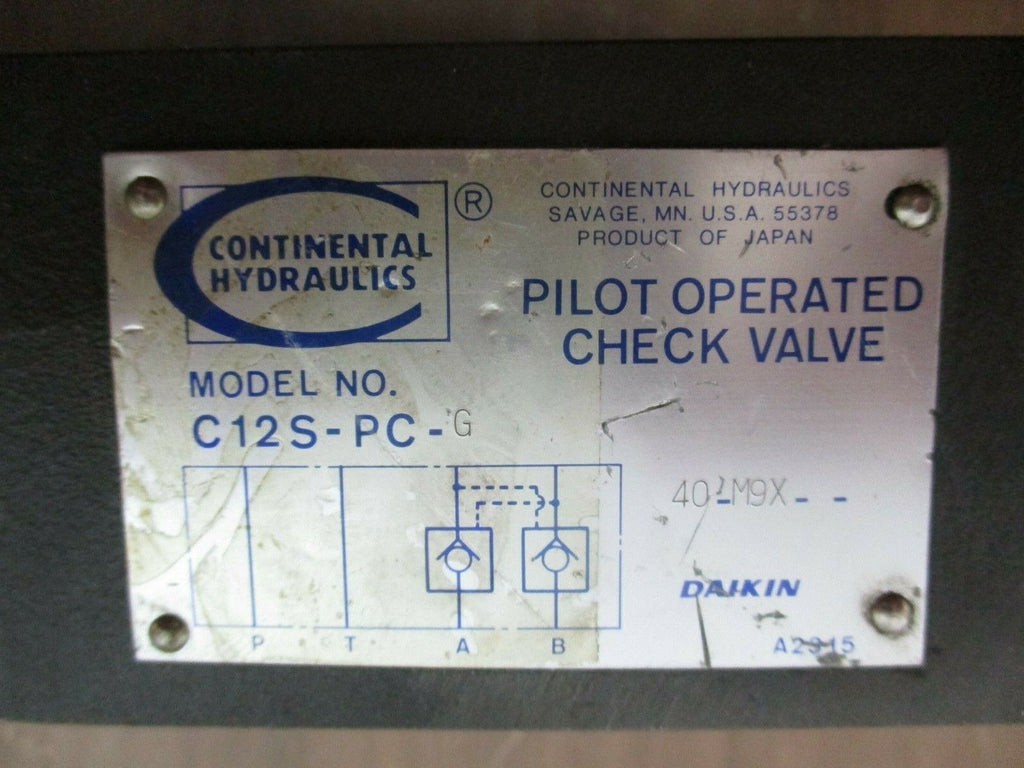 Continental Hydraulics Pilot Operated Check Valve C12S-PC-G Used Condition: UsedMPN: C12S-PC-GBrand: Continental Hydraulics Continental Hydraulics Pilot Operated Check Valve C12S-PC-G Used Continental Hydraulics Pilot Operated Check Valve Part #: C12S-PC-G Used Loc: 23B4-10 Continental Hydraulics Pilot Operated Check Valve Part #: C12S-PC-G Uséd Loc: 23B4-10