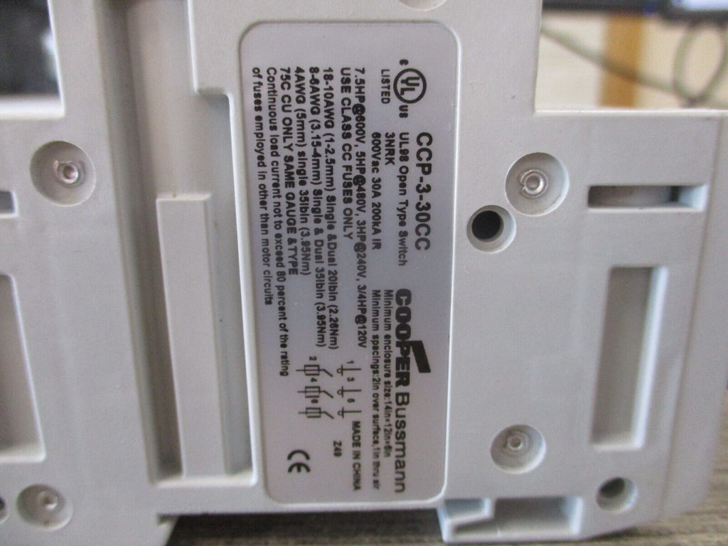 Cooper Bussmann Fusible Disconnect CCP-3-30CC 30A 600V 3P *Broken Mounting* Used Cooper Bussmann Fusible Disconnect Part #: CCP-3-30CC 30 A 600 V 3P *Broken Mounting*Used Loc: 15A5-17 Cooper Bussmann Fusible Disconnect Part #: CCP-3-30CC 30 A 600 V 3P Uséd