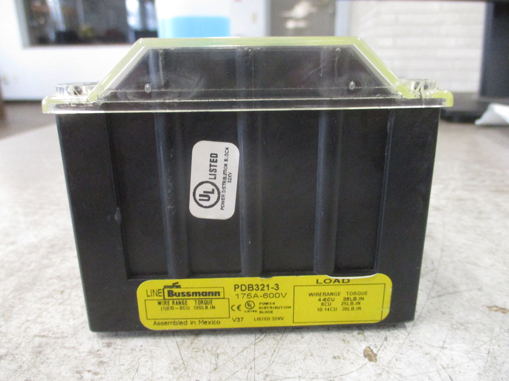 Cooper Bussmann Power Distribution Block PDB321-3 175A 600V 3P Line (1): 2/0-8 Load: 4-6,8,10-14 W/Cover Used LOC 58H3-12
