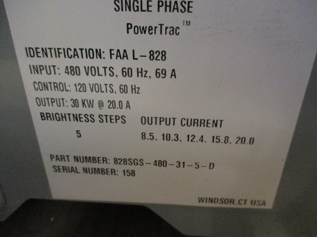 Cooper Crouse-Hinds PowerTrac Constant Current Regulator Part #: 828SGS-480-31-5-D Input: 480V 60Hz 69A Output: 30KW @ 20.0A Brightness Steps: 5 Output Current: 8.5, 10.3, 12.4, 15.8, 20.0 Single Phase Compliances: FAA AC 150/5345-10: L-828 New Surplus Weight: 1300 lbs LOC AB11-347 / AB38H4/AB38I4/AB38J4