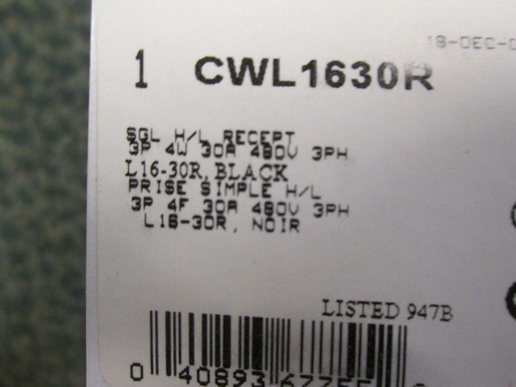 Cooper Receptacle CWL1630R 3P 4W 30A 480V 3Ph New Surplus Cond...