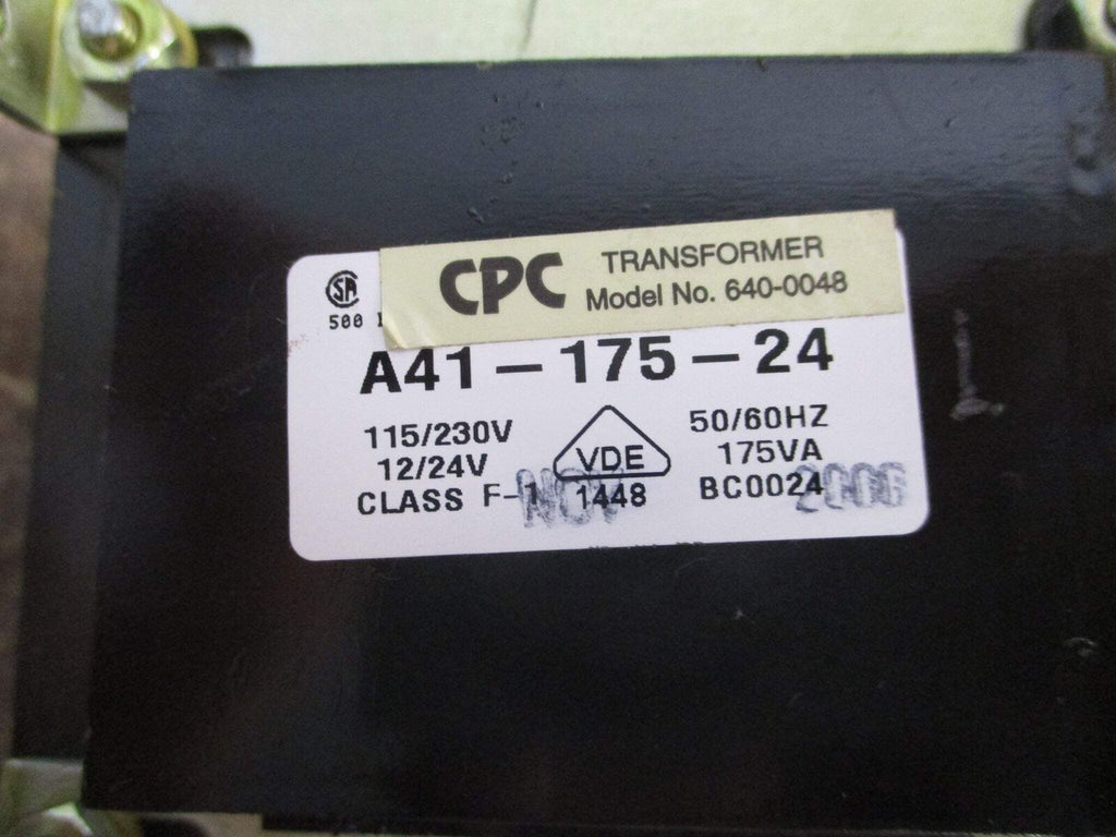 CPC Transformer A41-175-24 175VA Pri: 115/230V Sec: 12/24V 50/60Hz Used CPC Transformer Part #: A41-175-24 175 VA Pri: 115/230 V Sec: 12/24 V 50/60 Hz Used Loc: 59B1-1