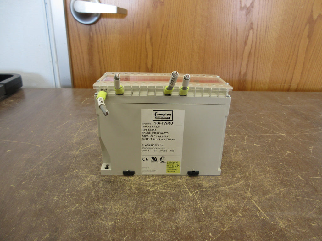 Crompton Paladin Transducer Part #: 256-TWMU-QQFA-C6-SS 120 V 0.5 A 60 Hz 0/1mA into 10K ohms Range: 0-1000W *Broken DIN Rail Mount* Used Loc: 57F5-4