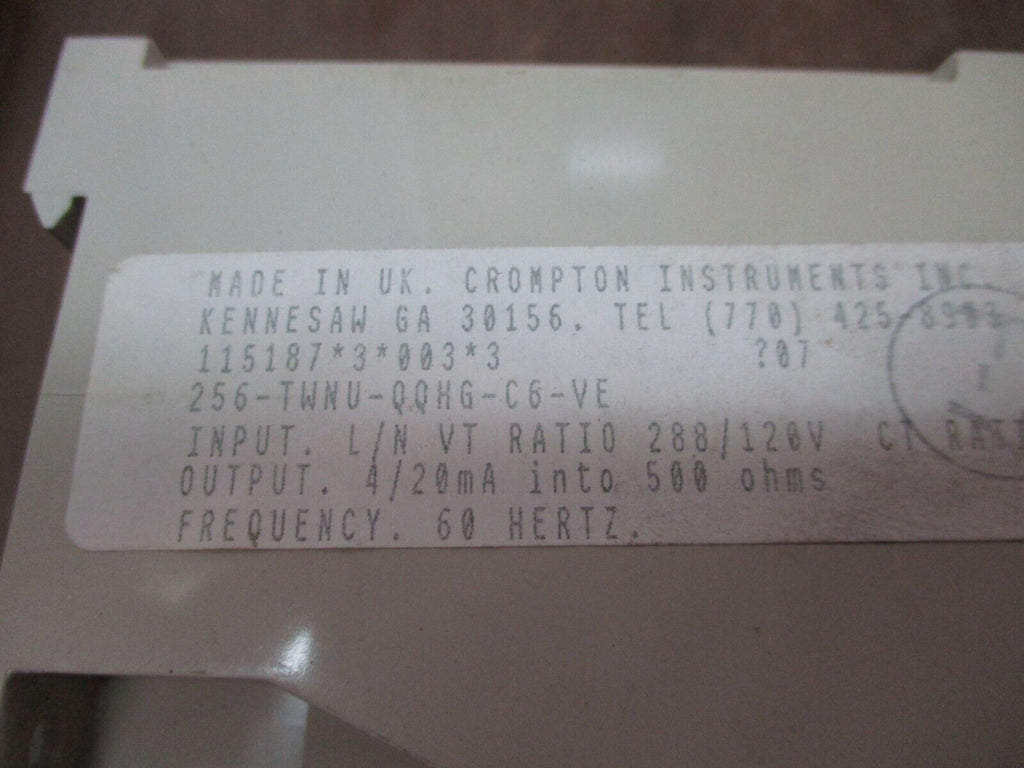 Crompton Paladin Transducer 256-TWNU-QQHG-C6-VE 120V PT: 288:120 CT: 2500:5 Used_x000D_ Condition: UsedBrand: CromptonMPN: 256-TWNU-QQHG-C6-VEType: Paladin Transducer Crompton Paladin Transducer 256-TWNU-QQHG-C6-VE 120V PT: 288:120 CT: 2500:5 Used Crompton Paladin Transducer Part #: 256-TWNU-QQHG-C6-VE 120 V PT: 288:120 CT: 2500:5 Range: 0-2000kW Used Loc: 23B5-23 Crompton Paladin Transducer Part #: 256-TWNU-QQHG-C6-VE 120 V PT: 288:120 CT: 2500:5 Range: 0-2000kW Uséd Loc: 23B5-23