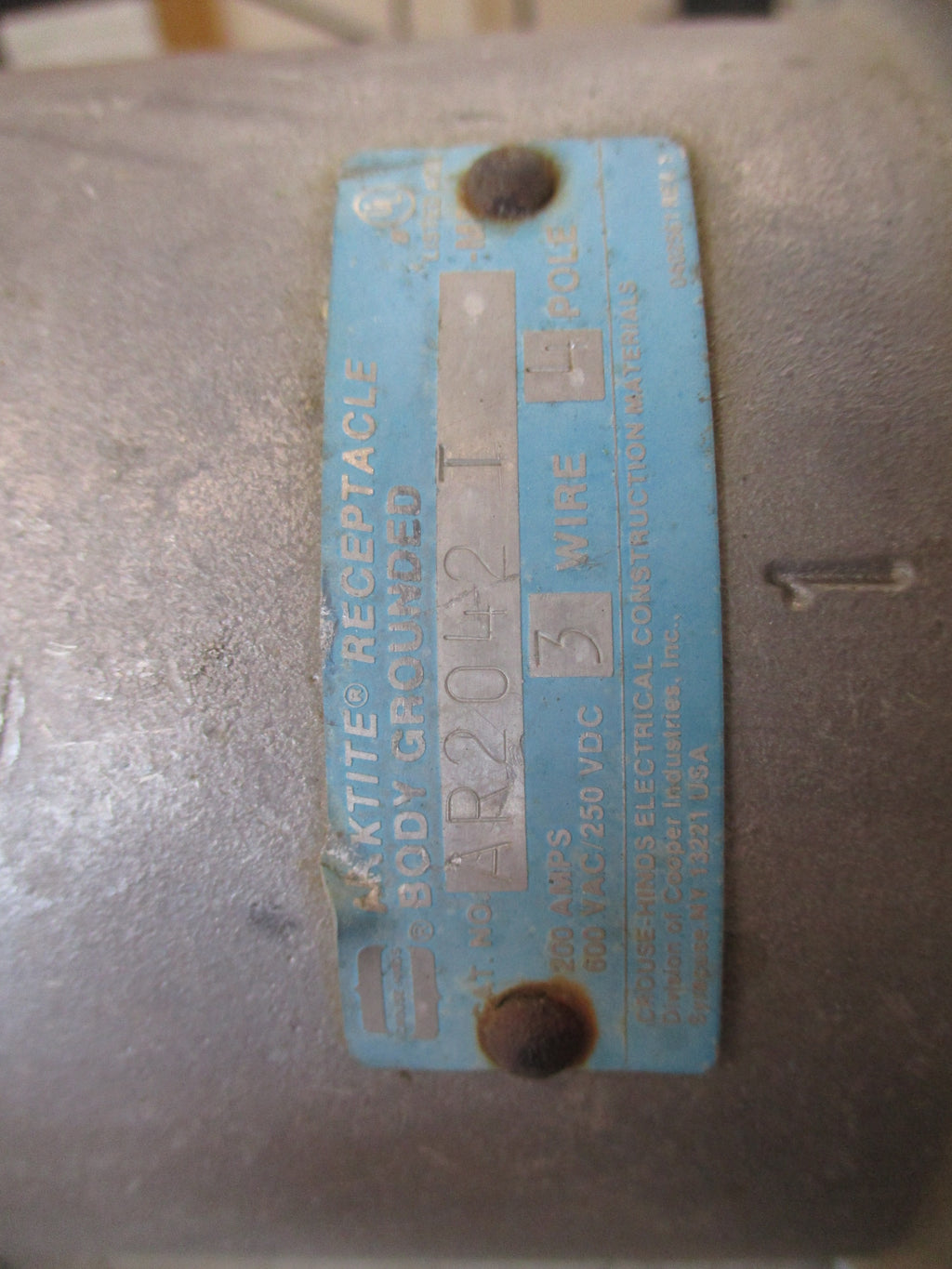 Crouse-Hinds Arktite Receptacle AR-2042 T 200A 600V 3P 4W Used
