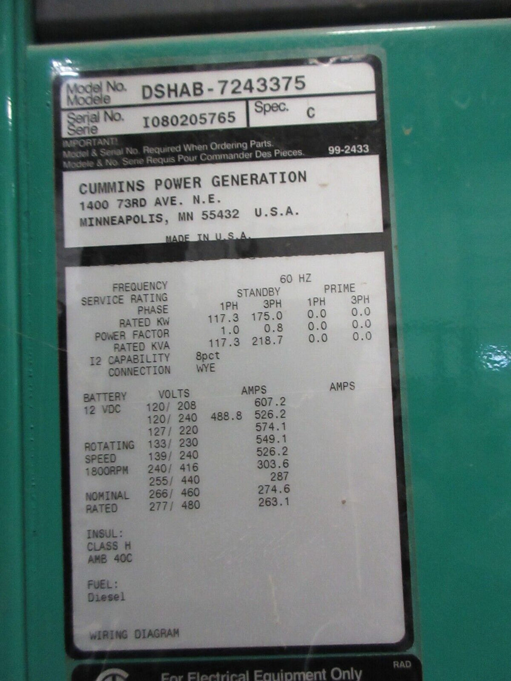 Cummins Diesel Standby Generator w/ Tank Part #: DSHAB-7243375 175KW @ 3Ph 117.3KW @ 1Ph 120-480 V 60 Hz Outdoor Enclosure Used Loc: AB11-5865