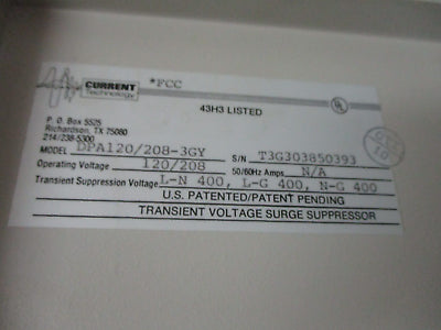 Current Technology DPA Series Power Siftor Generation II Surge Suppressor Used_x000D_ Condition: UsedBrand: Current TechnologyMPN: DPA120/208-3GY Current Technology DPA Series Power Siftor Generation II Surge Suppressor Used Current Technology DPA Series Power Siftor Generation II Surge Suppressor Part #: DPA120/208-3GY 120/208 V Ratings: 400V L-N, L-G, N-G Used Loc: AB11-4936 / AB5K4 Current Technology DPA Series Power Siftor Generation II Surge Suppressor Part #: DPA120/208-3GY 120/208 V Ratings: 400V L-N, L-G, N-G Uséd Loc: AB11-4936 / AB5K4