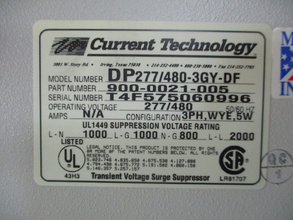 Current Technology Generation II DP Series Power Siftor Surge Suppressor Part #: 900-0021-005 Model: DP277/480-3GY-DF 277/480 V 50/60 Hz 3Ph Rating: 1000 V L-N / L-G 800 V N-G 2000 V L-L Used Loc: AB11-5299 / (AB1H1)