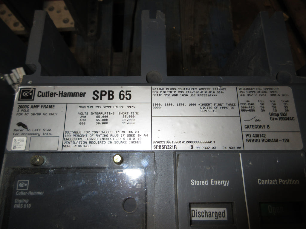 Cutler-Hammer Circuit Breaker SPB 65 2000C Amp Frame 2000A Rating Plug 600V Used