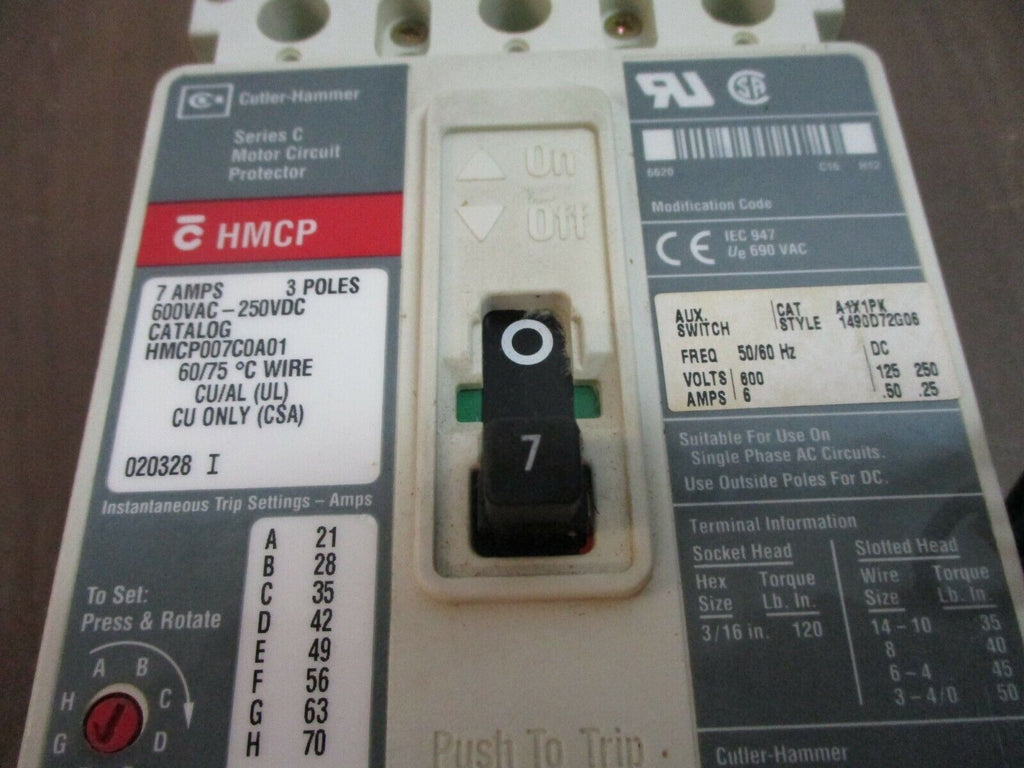 Cutler-Hammer Circuit Breaker w/ Aux HMCP007C0A01 7A 600V 3P U...