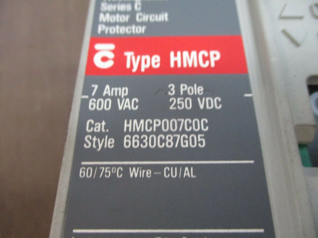Cutler-Hammer Circuit Breaker w/ Aux HMCP007C0C 7A 600V 3P Used_x000D_ Condition: UsedCurrent Rating: 1-15 AMaximum Amperage: 7 ANumber of Poles: 3MPN: HMCP007C0CNumber of Positions: 3Operation Method: On/OffBrand: Cutler-HammerVoltage: 551-600 V Cutler-Hammer Circuit Breaker w/ Aux HMCP007C0C 7A 600V 3P Used Cutler-Hammer Circuit Breaker w/ Aux Part #: HMCP007C0C 7 A 600 V 3P Used Loc: 22E4-52 Cutler-Hammer Circuit Breaker w/ Aux Part #: HMCP007C0C 7 A 600 V 3P Uséd Loc: 22E4-52