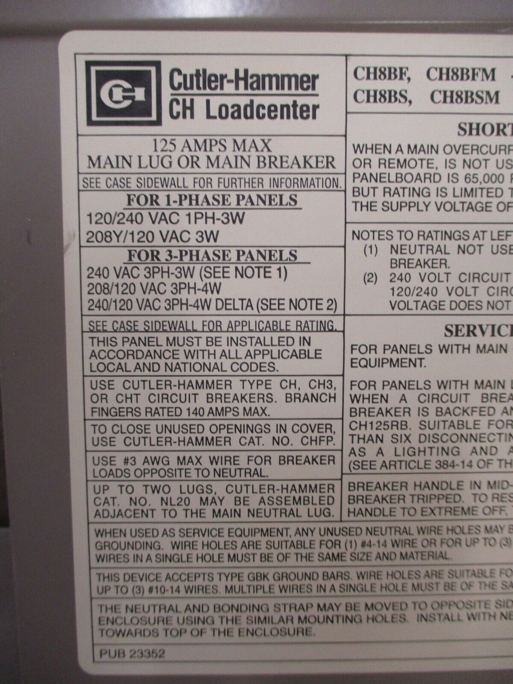 Cutler-Hammer Main Lug Load Center w/ Cover CH12L125B / CH8BSM 125A 240V 1Ph 3W Cutler-Hammer Main Lug Load Center w/ Cover Part #: CH12L125B / CH8BSM 125 A 240 V 1Ph 3W 12-Space Surface Mount New Surplus Loc: AB11-7232 / AB4B2 Cutler-Hammer Main Lug Load Center w/ Cover Part #: CH12L125B / CH8BSM 125 A 240 V 1Ph 3W 12-Space Surface Mount New Surplus Loc: AB11-7232 / AB4B2