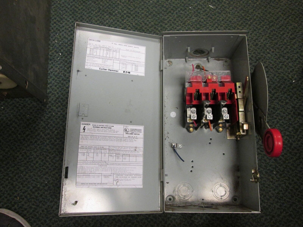 Cutler-Hammer Non-Fusible 3R Safety Switch DH361URK 30A 600V 3P Nema 3R Encl Condition: UsedBrand: Cutler-HammerMPN: DH361URK Cutler-Hammer Non-Fusible 3R Safety Switch DH361URK 30A 600V 3P Nema 3R Encl Cutler-Hammer Non-Fusible 3R Safety Switch Part #: DH361URK 30A 600V 3P Nema 3R Enclosure Usedloc 7h1-1 / 8D3 / AB12H2 Cutler-Hammer Non-Fusible 3R Safety Switch Part #: DH361URK 30A 600V 3P Nema 3R Enclosure Uséd loc 7h1-1 / 8D3 / AB12H2