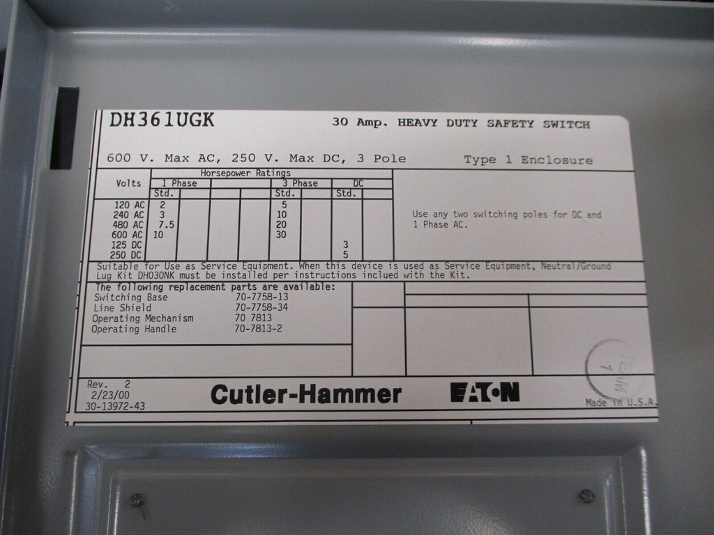 Cutler-Hammer Non-Fusible Safety Switch DH361UGK 30A 600V 3P Type 1 New Surplus