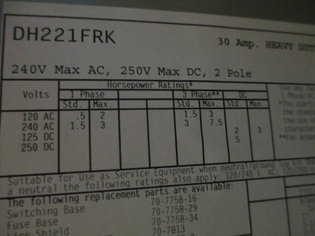 Cutler-Hammer Safety Switch DH221FRK 30A 240V 2P 3R Fusible New Surplus_x000D_ Condition: New – Open boxCurrent Rating: 16-30 AMaximum Amperage: 30 AType: DisconnectorMPN: DH221FRKOperation Method: On/OffBrand: Cutler-HammerVoltage: 201-250 V Cutler-Hammer Safety Switch DH221FRK 30A 240V 2P 3R Fusible New Surplus Cutler-Hammer Safety Switch Part # DH221FRK 30A 240V 2 Pole 3R Enclosure Fusible Heavy Duty New Surplus Loc# 7H2-18 / AB4G1 Cutler-Hammer Safety Switch Part # DH221FRK 30A 240V 2 Pole 3R Enclosure Fusible Heavy Duty New Surplus Loc# 7H2-18 / AB4G1