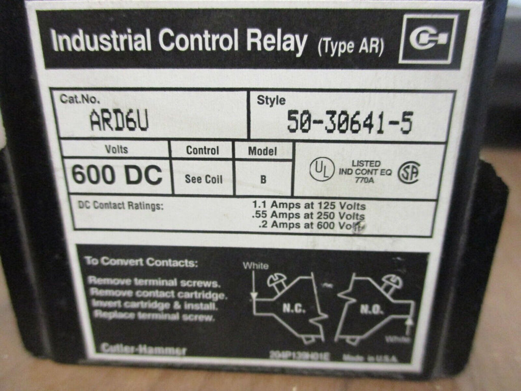 Cutler-Hammer Type AR Control Relay ARD6U 130VDC Coil 600VDC U...
