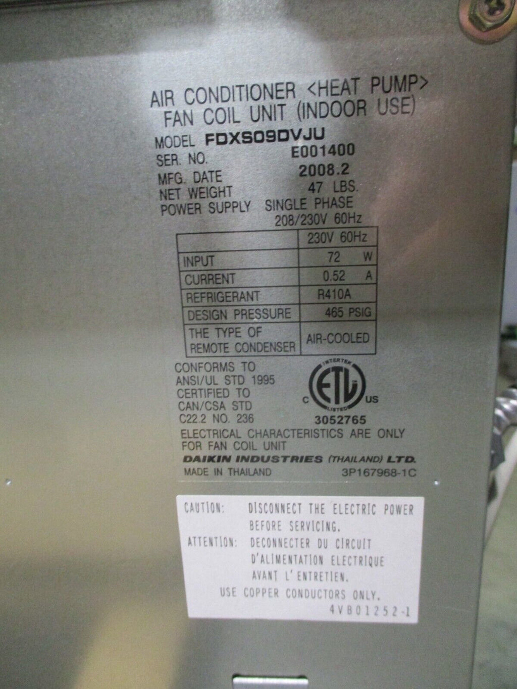 Daikin Air Conditioner/Heat Pump Fan Coil Unit FDXS09DVJU 208/230V 1Ph 60Hz Used