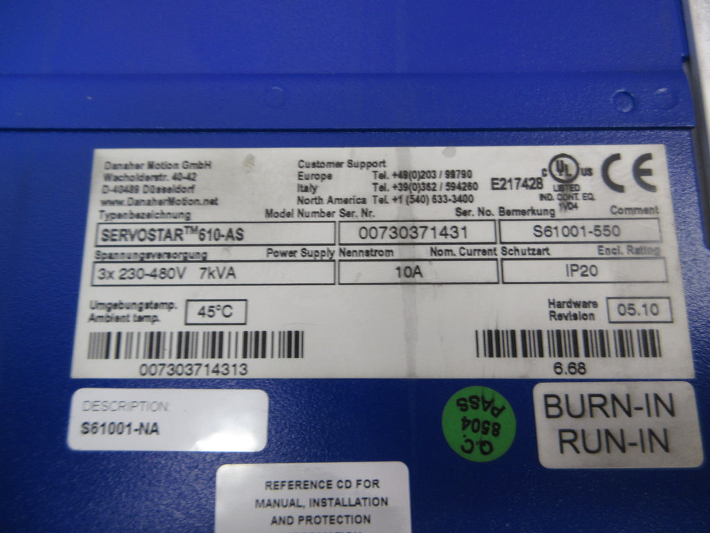 Danaher Motion Servostar 610-AS Servo Drive Part #: S61001-550 H/W Rev. 05.10 7kVA 230-480V 3Ph 10A Used Loc: 57E2-11
