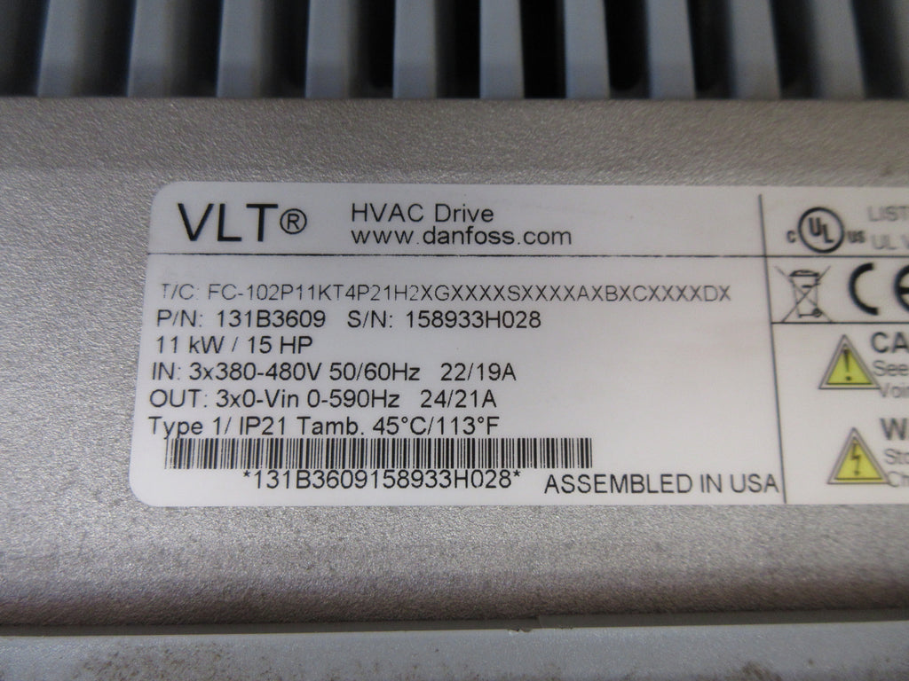 Danfoss VLT AC Drive Part #: 131B3609 15 HP 3Ph Input: 3x380-480V 50/60Hz 22/19A Output: 3x0-Vin 0-590Hz 24/21A w/ Keypad Used Loc: AB11-9046 / AB34A3