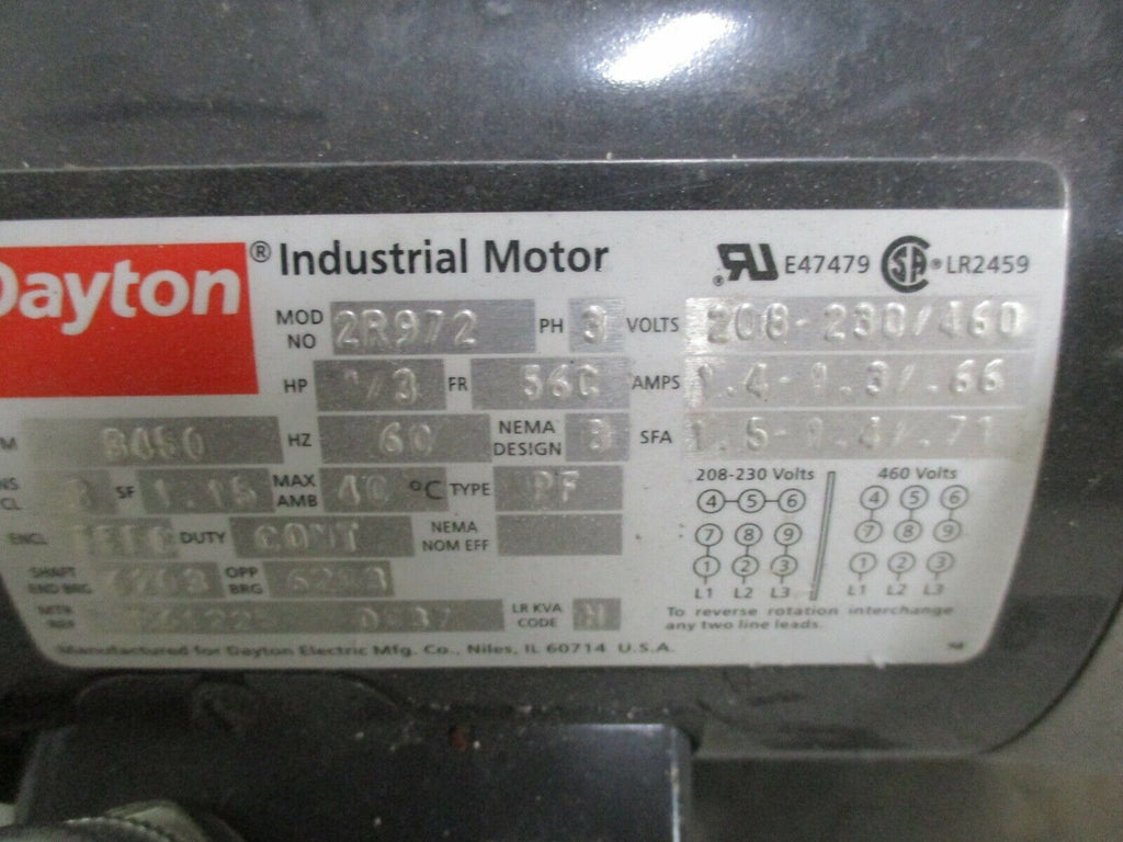 Dayton AC Motor 2R972 1/3HP 3600RPM 208-230/460V 1.4-1.3/0.66A 3Ph 60Hz Used