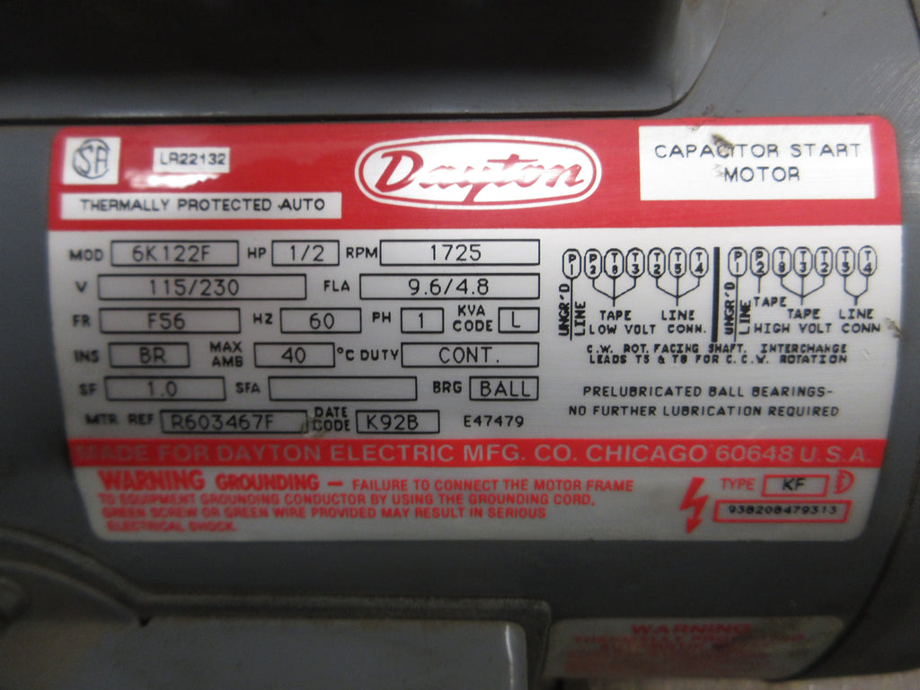 Dayton Motor Part #: 6K122F 1/2 HP 1725 RPM 115/230 V 9.6/4.8 A 1Ph 60 Hz Frame: F56 *Missing Wire Box Cover* Used Loc: AB11-8300 / AB25E2