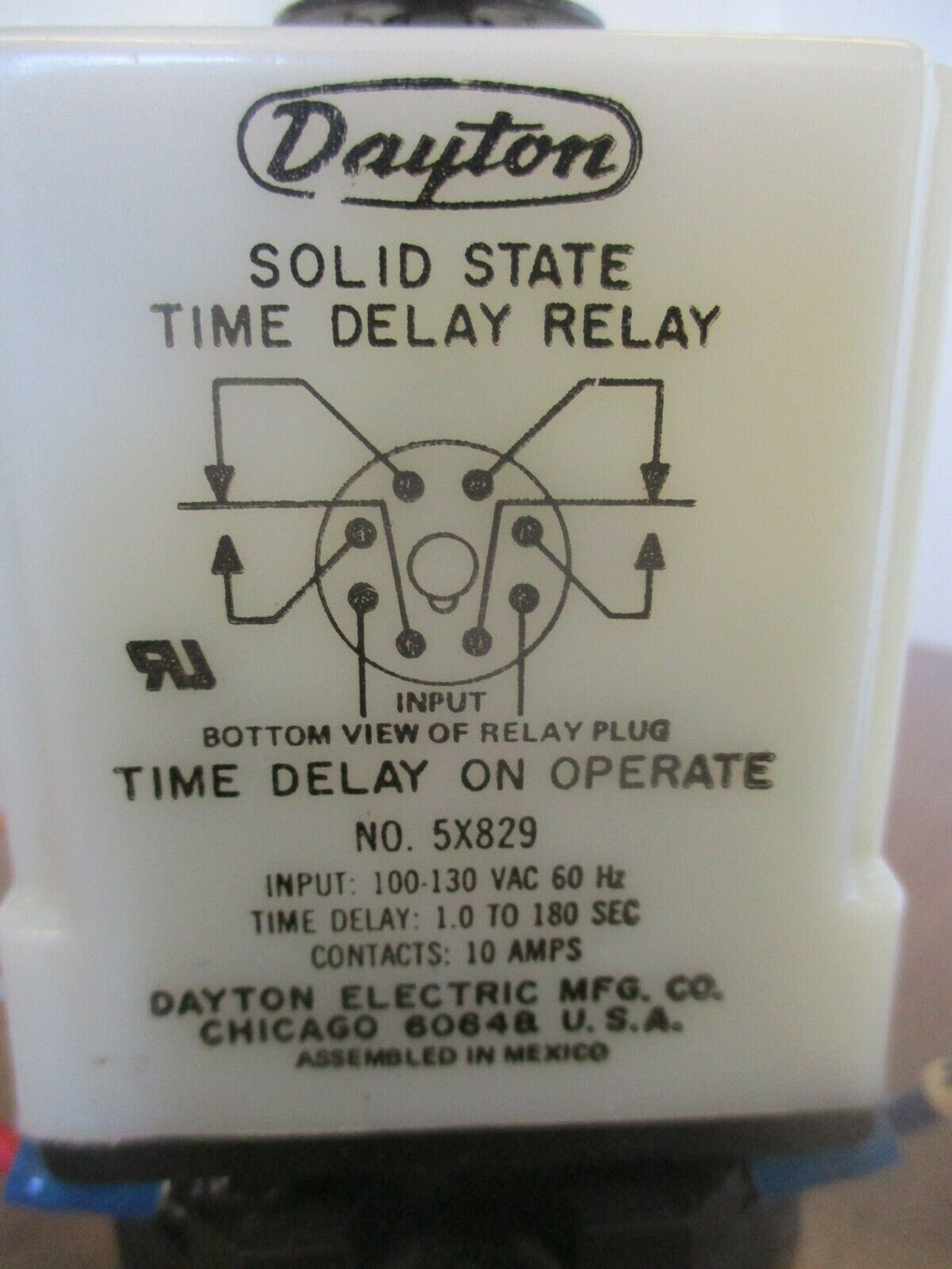 Dayton Time Delay Relay 5X829 Delay: 1.0-180 sec 100-130VAC 60Hz Used Condition: UsedCustom Bundle: NoMPN: 5X829Brand: Dayton Dayton Time Delay Relay 5X829 Delay: 1.0-180 sec 100-130VAC 60Hz Used Dayton Time Delay Relay Part #: 5X829 Delay: 1.0-180 sec 100-130VAC 60Hz UsedLOC 14C4-29 Dayton Time Delay Relay Part #: 5X829 Delay: 1.0-180 sec 100-130VAC 60Hz Uséd LOC 14C4-29