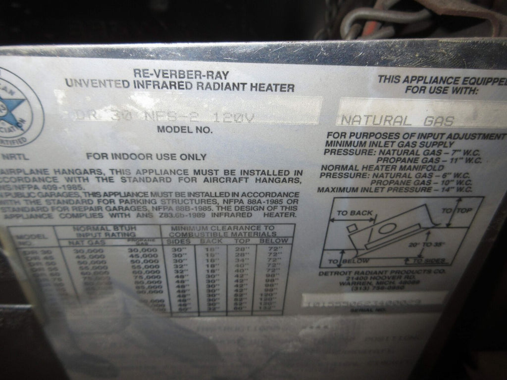 Detroit Radiant Products Re-Verber-Ray Infrared Radiant Heater DR 30 NFS-2 120V Detroit Radiant Products Re-Verber-Ray Infrared Radiant Heater Part #: DR 30 NFS-2 120V Natural Gas 120 VAC 30,000 BTU Used Loc: AB11-8143 / AB24C2