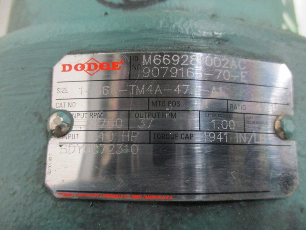 Dodge Gear Part #: 1-56C-TM4A-47 Ratio: 47.1Input: 3.1HP 1750RPM Output: 37RPMUsedLOC AB11-752 / AB39F2- Dodge Gear